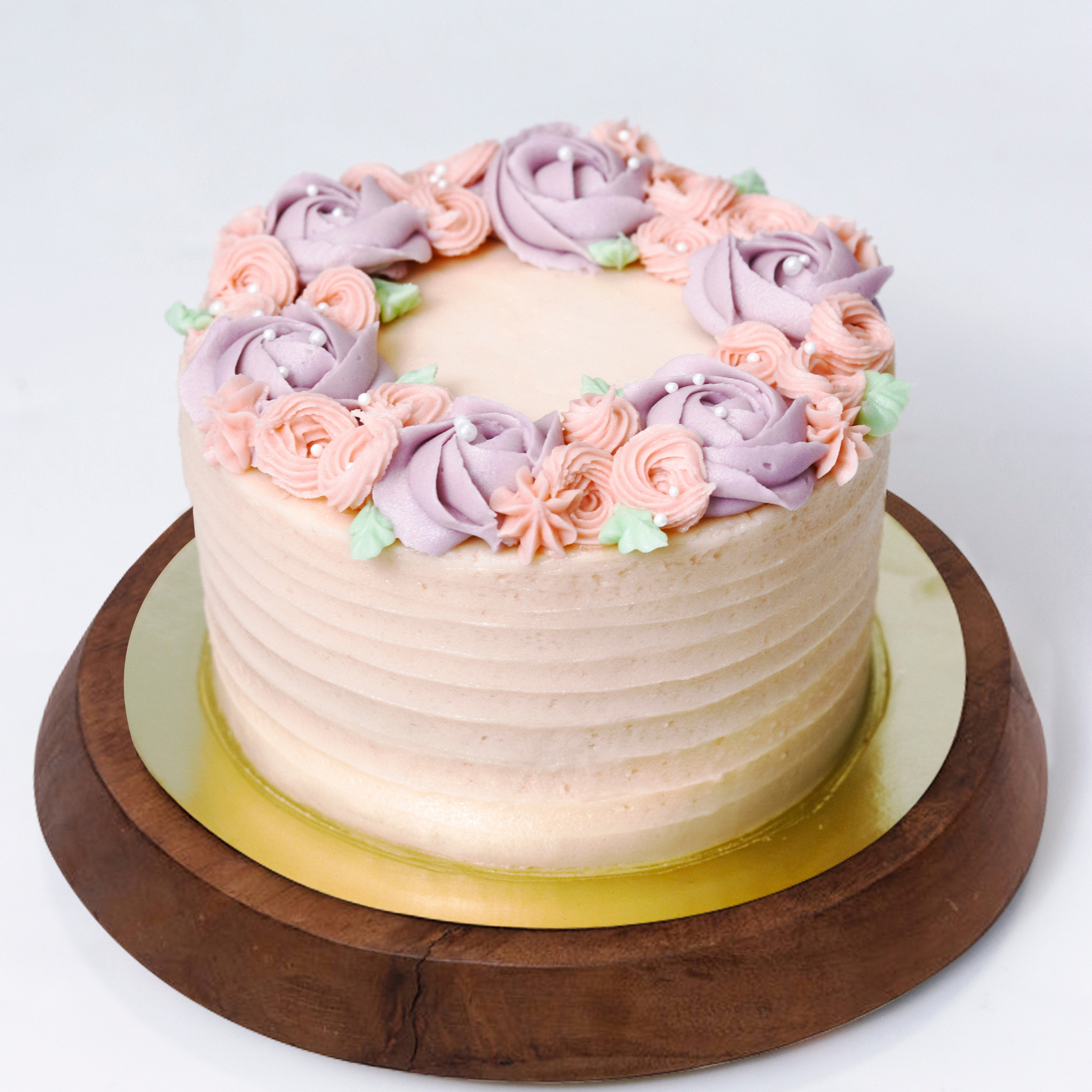 TPR's signature buttercream spread between layers of our light & soft victorian vanilla sponges, garnished with beautiful pink rosettes.